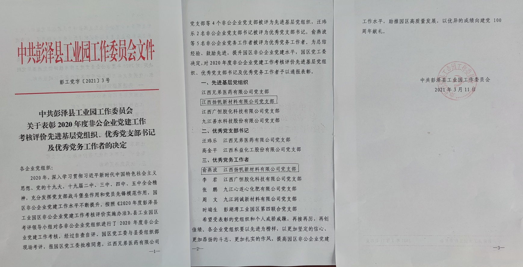 3月11日,園區召開2020年度非公企業黨建述職暨2021年非公黨建工作部署會,會上表彰了2020年度非公企業先進基層黨組織、優秀支部書記、優秀黨務工作者,我公司支部榮獲2020年度先進基層黨組織榮譽稱號,園區僅4家企業支部獲此榮譽,同時支部俞燕波同志被評為優秀黨務工作者。