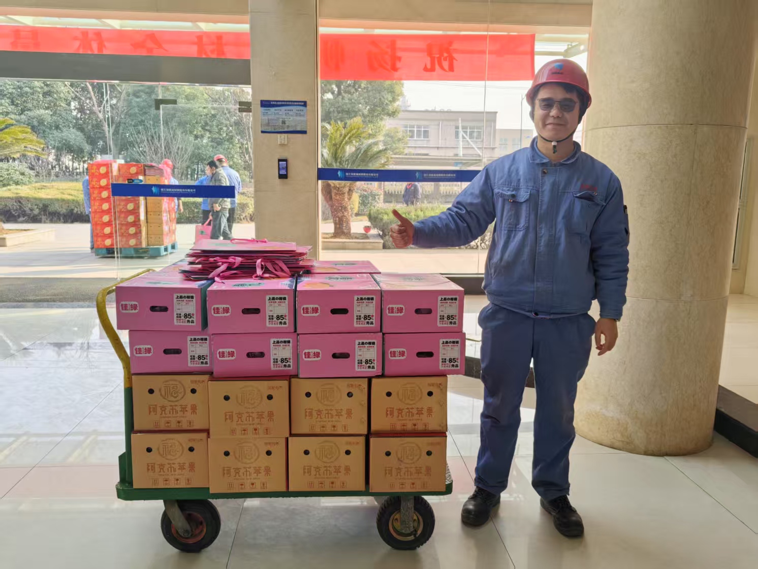 一份份沉甸甸的福利被傳遞到員工手中,承載著公司對廣大員工滿滿的關(guān)懷。前來領(lǐng)取福利的員工喜悅之情溢于言表。